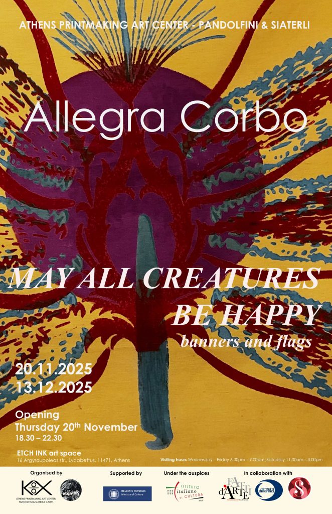 Το ΚΕΝΤΡΟ ΧΑΡΑΚΤΙΚΗΣ ΑΘΗΝΩΝ – PANDOLFINI & ΣΙΑΤΕΡΛΗ Α.Μ.Κ.Ε. παρουσιάζει την ατομική έκθεση MAY ALL CREATURES BE HAPPY – banners and flags (Είθε όλα τα πλάσματα να είναι ευτυχισμένα – πανό και σημαίες) της Ιταλίδας εικαστικού Allegra Corbo, στο χώρο τέχνης ETCH INK από τις 20 Νοεμβρίου έως τις 13 Δεκεμβρίου 2025.